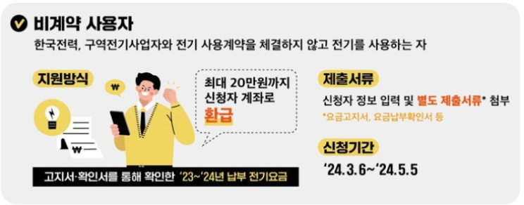- 만약 내가 비계약 사용자이신 경우, 즉 다른 사람의 명의를 사용하고 계시다면, 단독 전기를 사용과 다른사람의 명의인 경우에 해당합니다. 2023년 1월부터 2024년까지의 전기요금 고지서 사본을 필수로 제출해야합니다.