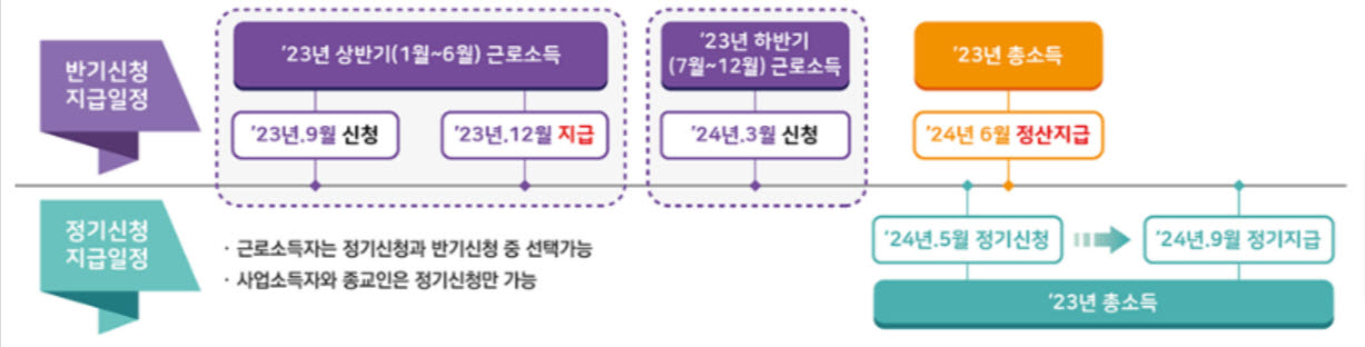 다음으로, 2023년 상반기 근로소득 있으신 분은 2023년 9월에 이미 신청하셨을 텐데요. 이번 3월 근로장려금 반기신청에서는 2023년 하반기 근로소득 있으신 분이 신청하시면 됩니다. 2024년 3월에 신청하시게 되면 하반기분만 지원금이 나오게 되고, 지원금 지급일은 2024년 6월에 근로장려금이 지급됩니다.
